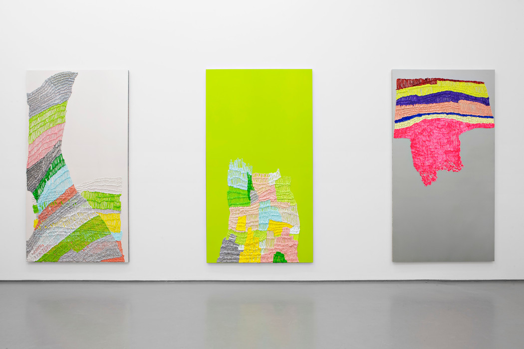 In the series Handmade she has woven a structure of acrylic paste on varnished alucore panels, thereby creating an irreversible three-dimensional drawing in a shallow relief. In some, the relief is delicately coloured with a fine paintbrush – in others the structure is covered under new layers of spray paint. The colour scheme spans soft pink to decadent neon nuances. The result is a series of paintings with a strong sculptural feel and materiality as well as painterly qualities – some more timid and some more forceful in their own weight – where Giæver’s background and interest in textiles and fascination over natural micro/macro patterns is clearly visible. As in earlier series, the common feature in these works is the energy and distinctive properties of colour itself, which is always treated in regard to the material and work methods.