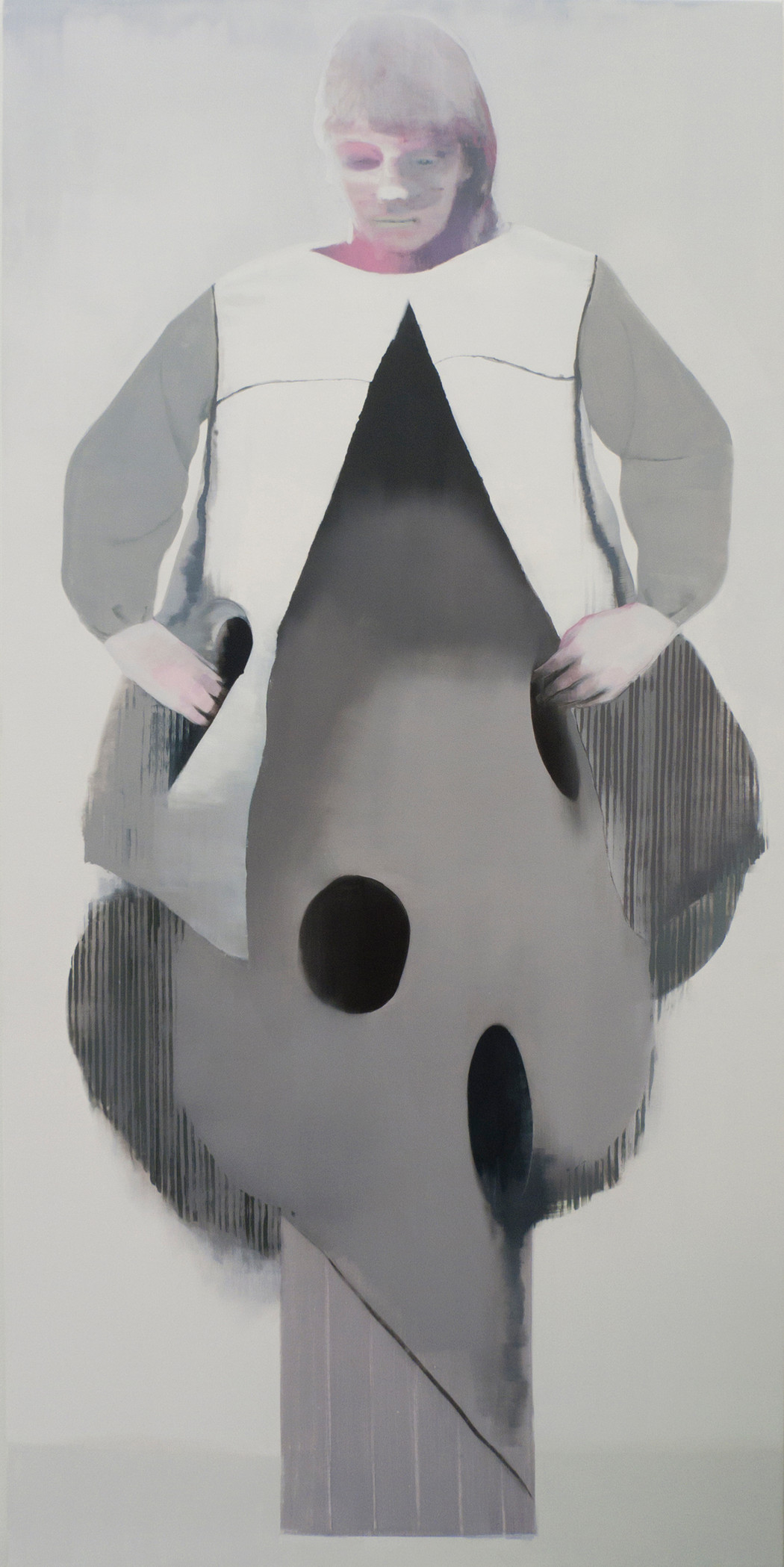 The scenes taking place in the paintings are reminiscent of stills from inexplicable chamber plays; frozen theatrical events with seemingly bizarre situations where various characters appear to be involved in complicated emotional relationships. The silence between lines, or a solitary person contemplating. In one painting, “Mole Fingers” a woman stands with her head slightly slumped, with a body shaped like an arrowhead, penetrated by holes. Her gaze realistic, the rest of the image is dreamlike. A paradoxical union pointing to the artists’ interest in creating a method for depiction of felt emotions, rather than “reality”. Who are these characters and how can we fathom these rooms? Homstvedt expresses boundlessness in his painterly decision-making and in doing so treats the viewer to a grand performance.
