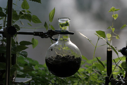 Studies at KTH have shown that the yellow Admiral butterfly uses its front legs as drumsticks to knock on plants during specific periods of time. The butterfly’s favourite is the nettle, which biologically is – like humans – categorized as eukaryotes. Scientists believe that the drumming is performed to extort chemical information from the plant. Ödlund has through her studies of the phenomena identified certain patterns and rhythms, her artistic interpretation being that the butterflies with their drumbeats induce the plant to hypnosis and in this disarmed state it reveals its chemical secrets. These studies have begotten to some of the works in the exhibition including sculptural installations where living plants seem to have taken over the laboratory environment and in which nettles are exposed to sound and music. Here she touches on the controversial scientists Cleve Backster and Dorothy Retallack who in the 1960s and 70s independently performed experiments on plants, which lead them to infer saplings with emotions and communicative abilities. Backster used his polygraph machine, while Retallack conducted experiments exposing seedlings to Indian sitar music and Led Zeppelin (concluding that the latter made them wither and lose their spark of life).