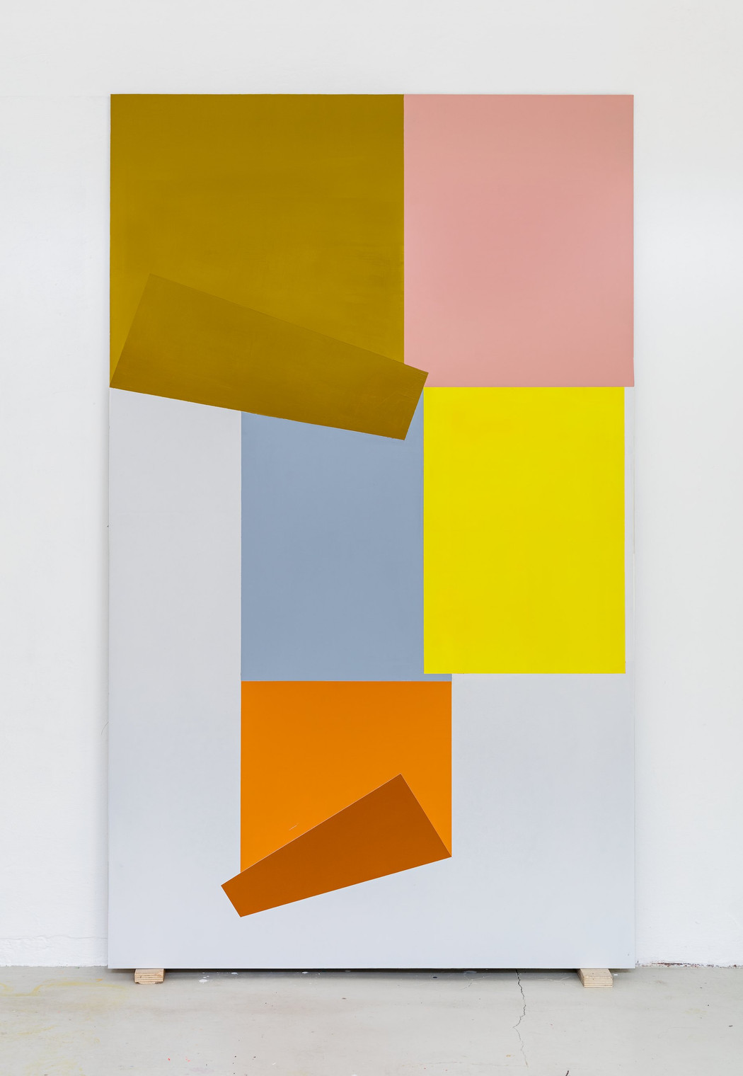 Using a pre-determined set of rules and modules based on standard paper sizes, applying paint in shallow reliefs with a spatula, the partly overlapping sheets of color sometimes fold over themselves. The resulting compositions emanate a playful rationality, contrasting the untreated organic grain of the plywood supports or floating on top of the slick rectangles of spray painted alucore.