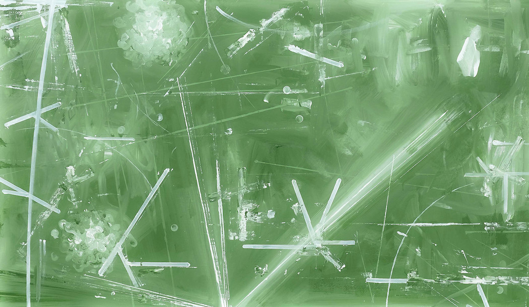 I suppose that’s what gave me the point of departure and then triggered off the two large, green paintings with clamps and aluminium profiles. They are similar to other work based on imagery recording subatomic traces but a further development in the sense that, here, I “added” the quantum phenomenon that particles even great distances apart change instantaneously into the same state if the state of one of them is changed. As I have said on other occasions, these are not paintings about quantum physics, a ridiculous undertaking; I have merely used what I saw as certain painterly possibilities and, with these works, expanded the vocabulary, as it were.