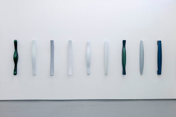 The last central work in the exhibition are nine wall-sculptures related to the artist’s on-going series of “boat-shaped" wall-based sculptures, “Score for a longer conversation". These nine objects differ from the rest of the series with their simple shape, which rather inspire thoughts of designed functional objects such as door-knobs or different kinds of weldings. The execution in highly polished stainless steel accentuates this. Because the sculptures are considerably larger (120 cm height) than the objects they are associated with, a feeling of displacement and humor is awakened in the beholder.