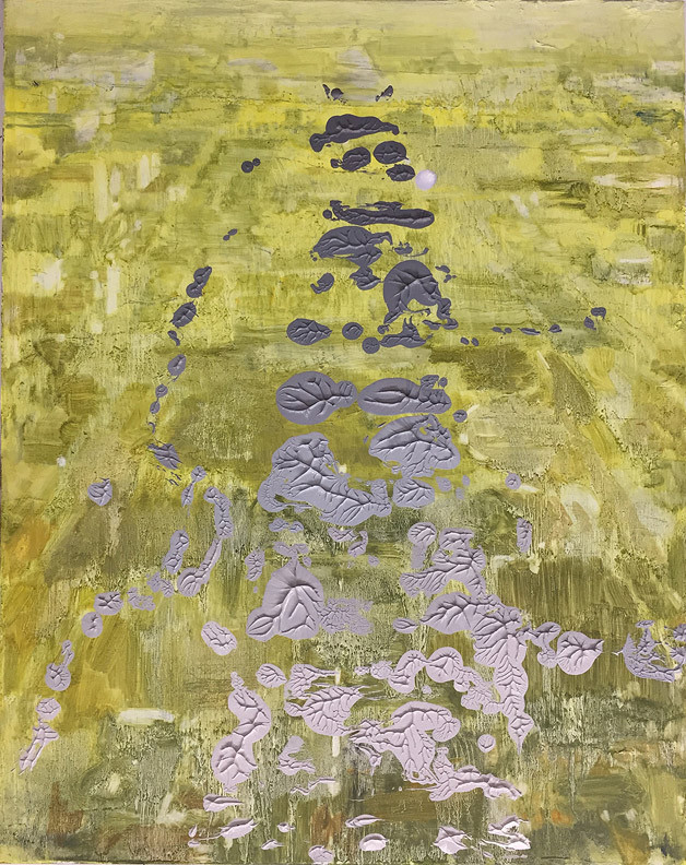 The two Bigger Half paintings lead the way into Røgebergs current process. The background image of these canvases are different views of the Zucotti Park in lower Manhattan. On top of one of these cityscapes, the artist has applied an additional massed form, which she then presses into the other, transferring a hazy echo of pigment between the works and charging one with the imperative of the other. The obfuscation by these slippery forms gives distance from the images beneath, partially concealing and filtering them into a possible new interpretation. The smaller zerosandones paintings share the performative element of offsetting a still wet painting onto the next canvas, diffusing the underlying image and forcing the artist to handle the abstract form as a representational image in its next iteration.