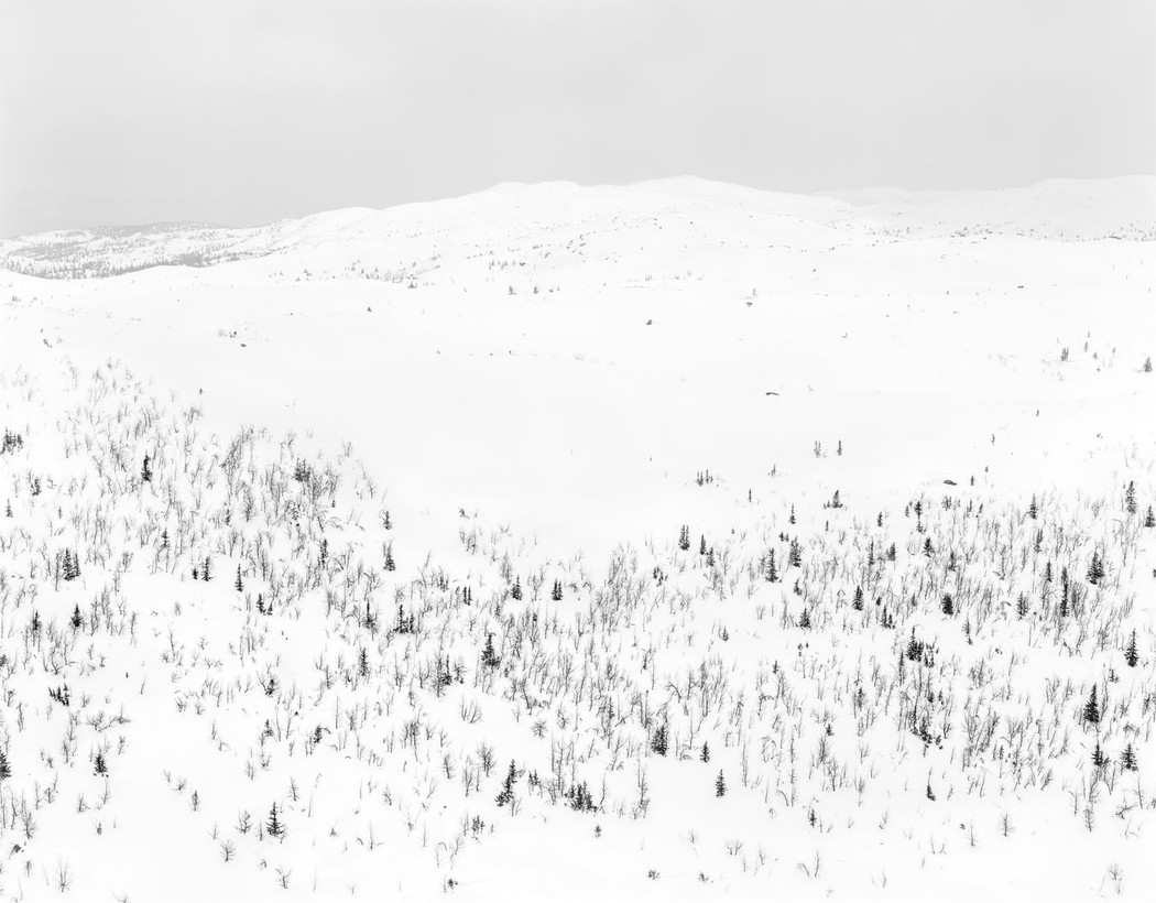 The mountain area surrounding Eggedal in Buskerud County, Norway was an important location for Per Berntsen when working on his analogue black and white photographs of landscapes in the 1980’s and 90’s. In the fall of 1985, he made a compelling series consisting of images without a horizon, which investigated the shifting nuances and textures of the ground and vegetation in the area. In the first half of May that same year, Berntsen captured a number of images from views over the snow-covered landscape. With a graphic spectrum composed from the white snow and the dark conifer and birch trees, these wide views share the all-over effect with the later vegetation studies. Only four of these images have previously been exhibited, but they have become an important and characteristic part of Berntsen’s oeuvre. While working on the digitalization of his early film negatives, he has restored eight additional images from this series. These are now printed in large format, as archival inkjet prints on baryta paper. We are pleased to present these works for the first time, under the title ‘May 1985’, exactly thirty-five years after they were conceived.