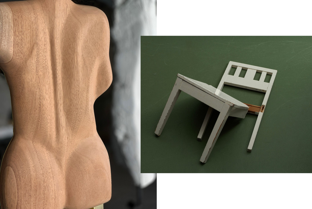 The Ghost is the result of a wrestling match with a large slab of clay, forced into the shape of a fold, harnessed and contained with textiles. A body contracting and closing in on itself, an act of defense or escape. The Tree, a respiratory system petrified. Grief and pain have entered this corpus. A glowing Brass Painting carries the imprint of a clay body, angelic and ephemeral.