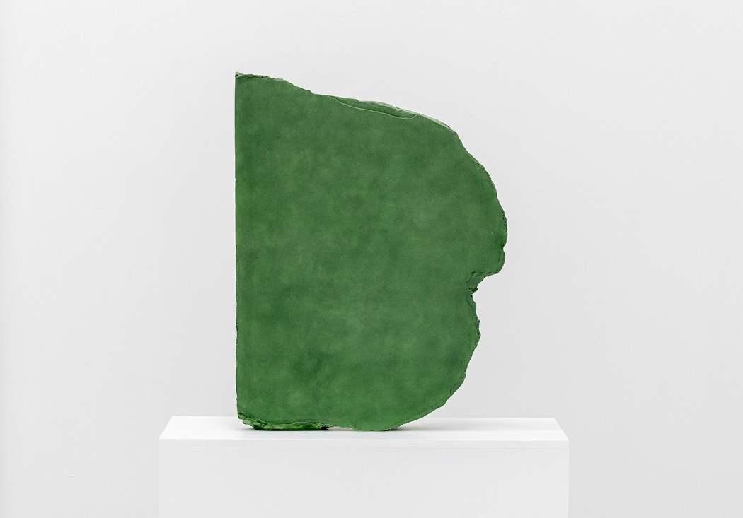 There are two groups of sculptures, all of which are made of plaster painted with shellac mixed with celadonite and iron oxide. One series is entitled re-set, and is based on parts from various casts of a digitized and sintered version of Rønning’s sculpture dbl blnd from the 1990s.