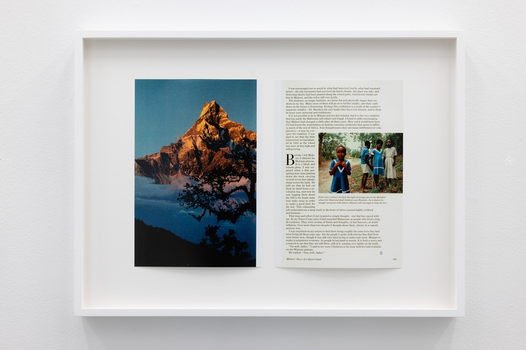 The piece relies on a shared encounter with vintage popular media, in this case a magazine like National Geographic. In its former ubiquity and semantic force, it can exemplify how we consider and perceive both ideas: nation and geography. Within the magazine’s name exists a paradox. The national, as it is mapped by political forces in relation to given topographies in features such as rivers and the mountain ranges that are as mighty as they are unconcerned with the designation of any border. And, the geographic, which is connected to the deep time of geological record, and yet, since the age of the enlightenment and the onset of romanticism, has been tethered to identifications with landscape. Against this backdrop, geography as landscape, and certainly landscape photography, is an image-idea that functions as both generator and pawn in the game of national identity. Ultimately, the implications of these terms, and the images that cling to them, inform our place in the world.
