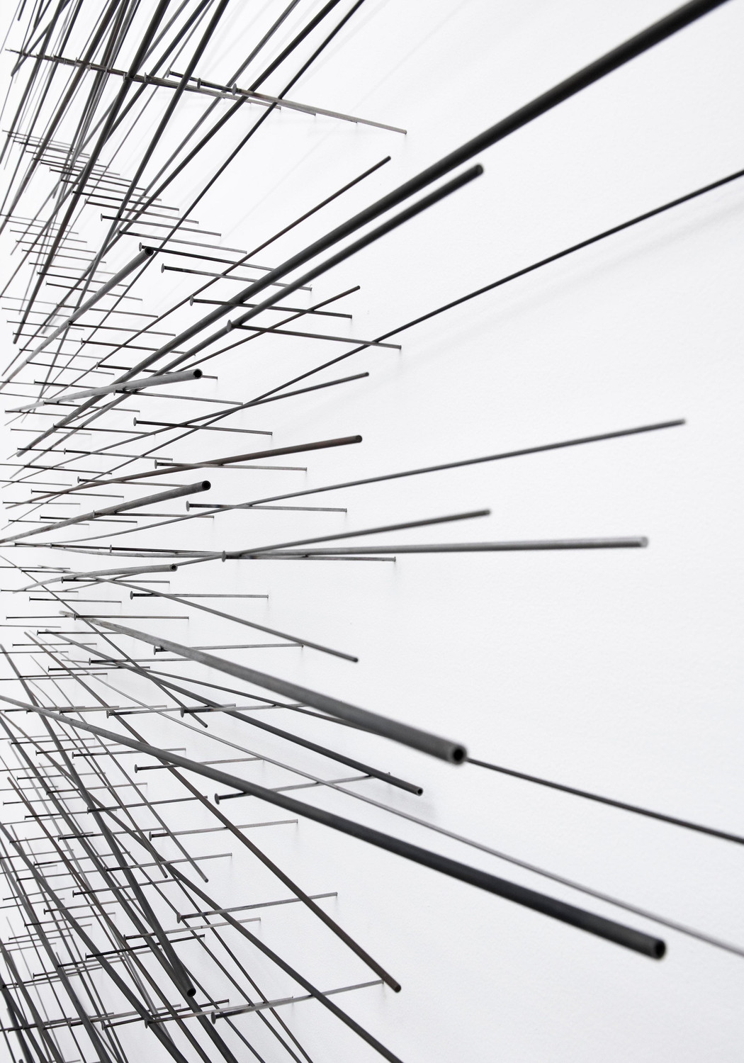 In her following three exhibitions with Galleri Riis (2004 to 2011), Vigeland left the podiums behind and took on the space with simple and delicate works, as well as installations comprising numerous parts, extending from the walls or hanging from the ceiling – playing with, and off, the architecture of the gallery. The materials were steel tubes, rods and piano wire, sometimes with silver joints and fittings. The style was both elegant and monumental.