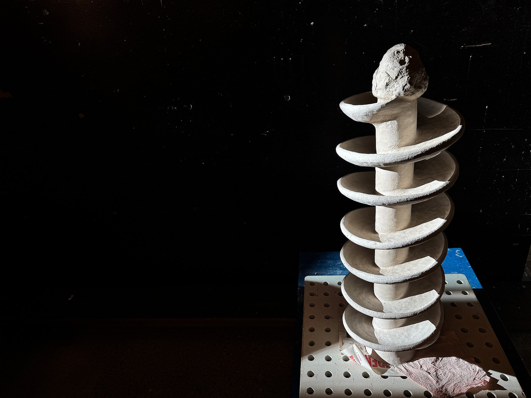 Johnslien highlights material transformations based on Norwegian minerals and makes visible the alchemical principle that all substances contain a seed of their opposite. In the white surfaces there are traces of a dark, material origin. A wave consisting of 800 small porcelain combustion boats, filled with an equal number of variations of titanium dioxide glaze, meander through several of the gallery’s rooms, and the phases of the moon rise above the gallery’s longest wall. In spiral-shaped ceramic towers, glaze flows in delicate bands from its origin in the ilmenite stone. A photographic print from glass negatives of microscope photos found in Titania’s old laboratory transports us from the mine in Sokndal to the cosmos.